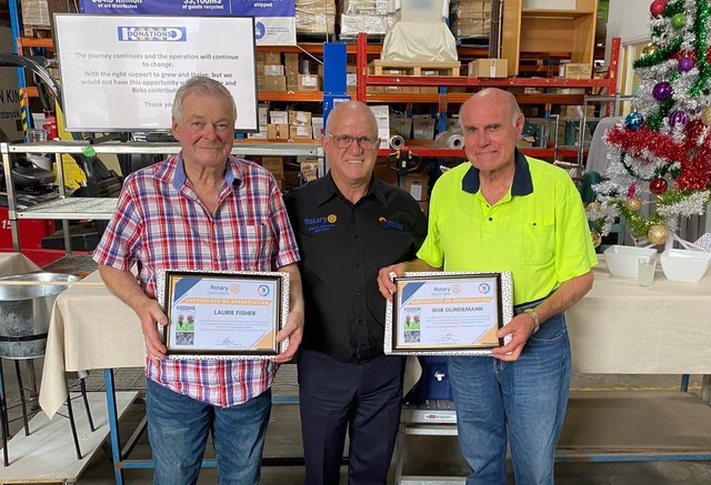 DG Ron Payne was generous in his praise of the work of the volunteers who help Rotary at the DIK Store, before presenting retiring Bob Glindemann and Laurie Fisher with Rotary Certificates of Appreciation.