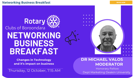· Rotary Clubs of Boroondara Networking Business Breakfast Thursday 12th October at Hawthorn Arts Centre. The organising committee have asked Clubs to send two members (Vincent and myself) as local representatives and to invite small business owners who will benefit from the guest speaker panel discussion, which includes Dr Michael Valos as the Moderator.
