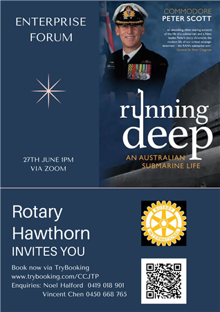 he Club’s next monthly Zoom meeting on 27 June is not to be missed. It is the latest in the series of Enterprise Forums organised by Vincent Chen and the Vocational Service Committee. The speaker will be Commodore (Ret) Peter Scott, who served in 10 submarines during his 34-year career in the Submarine Arm of the Royal Australian Navy. He will speak about life as a submariner, and no doubt proffer some thoughts on Australia acquiring nuclear-powered submarines.