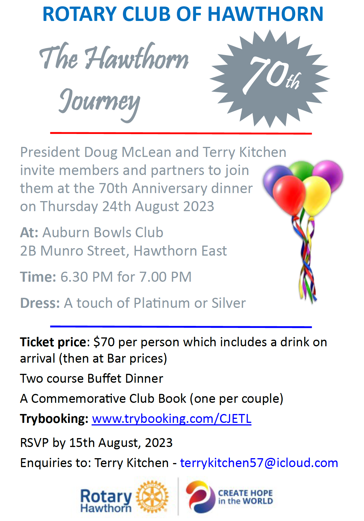 · Rotary Hawthorn 70th Anniversary Dinner. The Club’s 70th Anniversary Dinner will be held on Thursday 24th August, the anniversary of the actual date on which Rotary Hawthorn received its charter. Bookings can be made online at www.trybooking.com/CJETL. Don’t miss this opportunity to celebrate all that has been achieved by our Club over 70 years. The Social Committee has planned an evening of fun, historical tributes and fellowship. Wear a touch of Platinum or Silver!