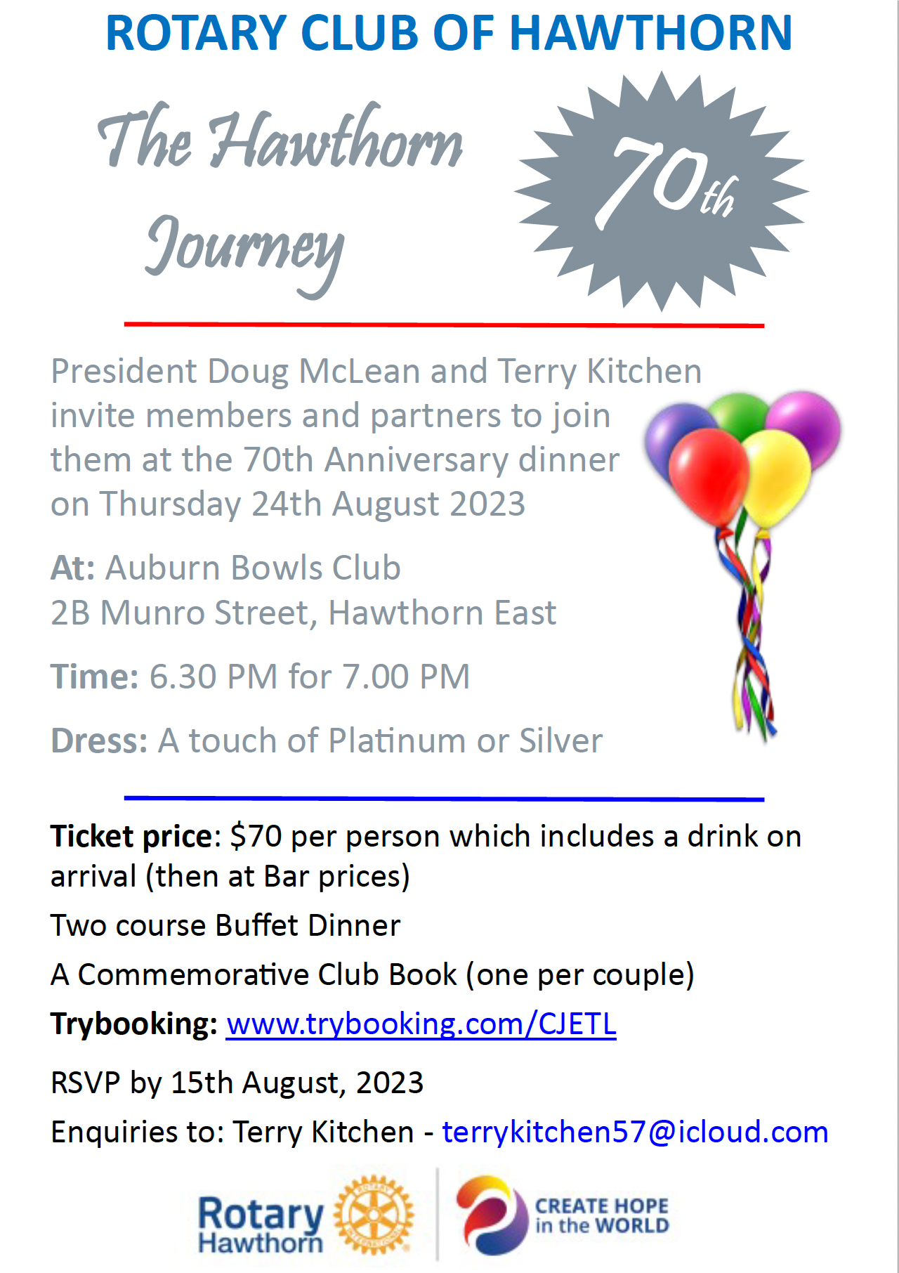 horn 70th Anniversary Dinner. The Club’s 70th Anniversary Dinner will be held on Thursday 24th August, the anniversary of the actual date on which Rotary Hawthorn received its charter. Bookings can be made online at www.trybooking.com/CJETL.