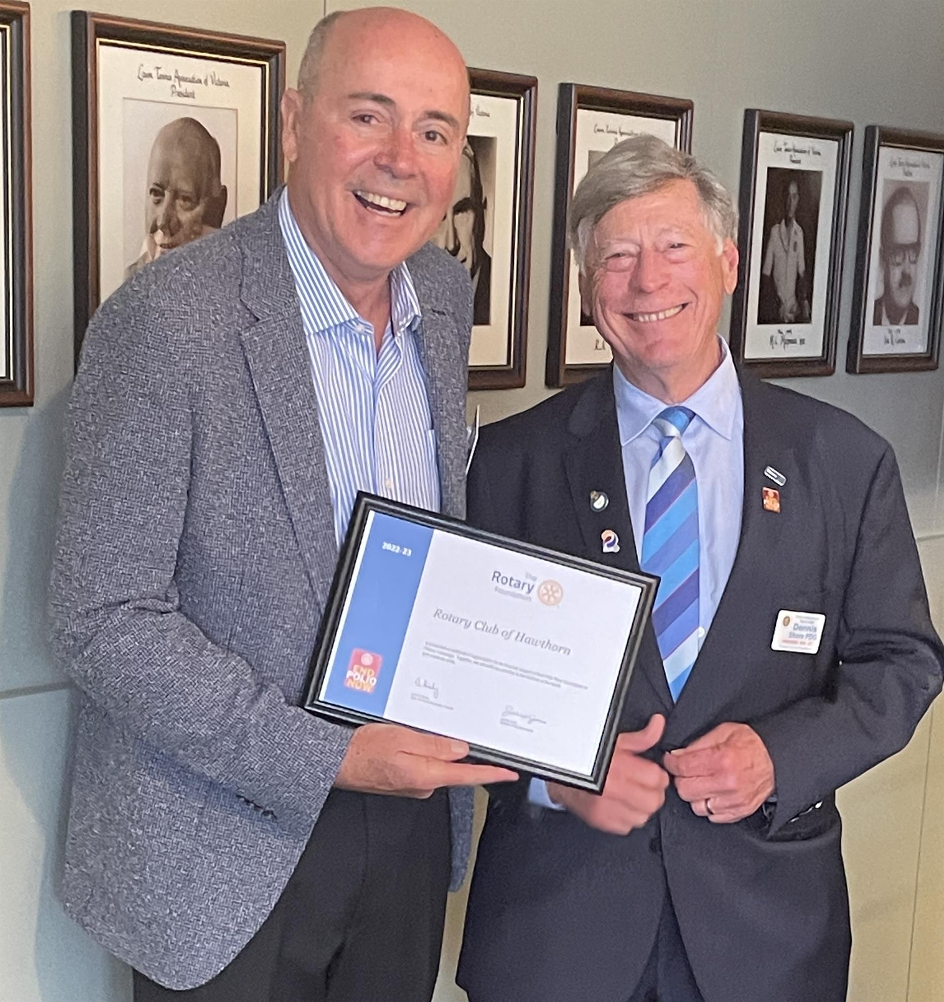 At the meeting, on behalf of the Club, I was pleased to accept an award from the Rotary Foundation for our financial support to the End Polio Now: Countdown to History Campaign presented by Dennis Shore.