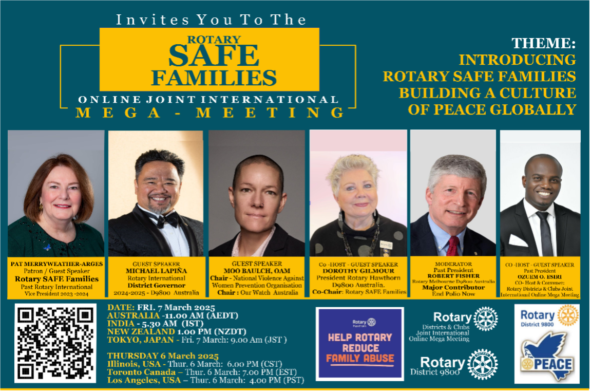 Rotary SAFE Families – Building a Culture of Peace Globally - International Mega Meeting – Friday 7 March at 11.00 am AEDT Register Here: https://bit.ly/4h71B1o
