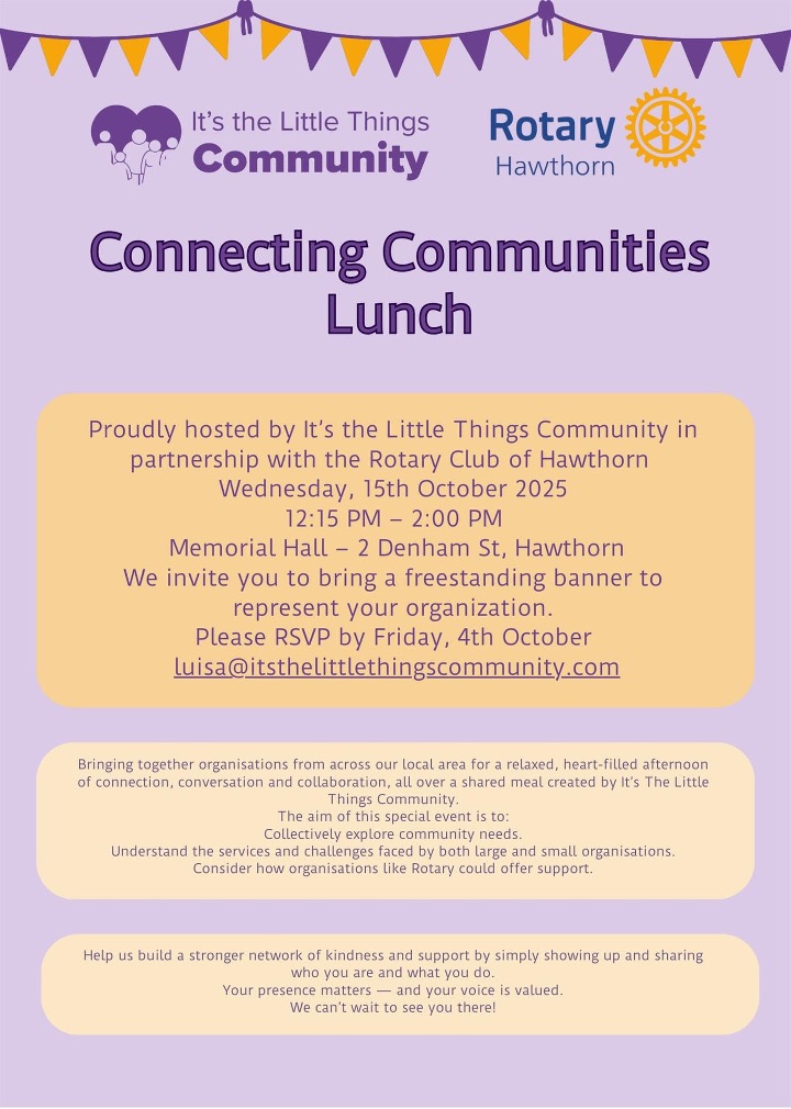 Within our own club, the induction of Min Bell, our first new member for 2025–26, brings fresh energy and new talent to our ranks, while the return of long-term members such as Phil Stewart reminds us of the enduring fellowship and connection that define Rotary. Both renewal and continuity are vital to a strong and thriving club. I’m also looking forward to our Connecting Communities Lunch next week, which promises to be an exemplary collaboration between a Rotary Club and a community-based volunteer organisation.